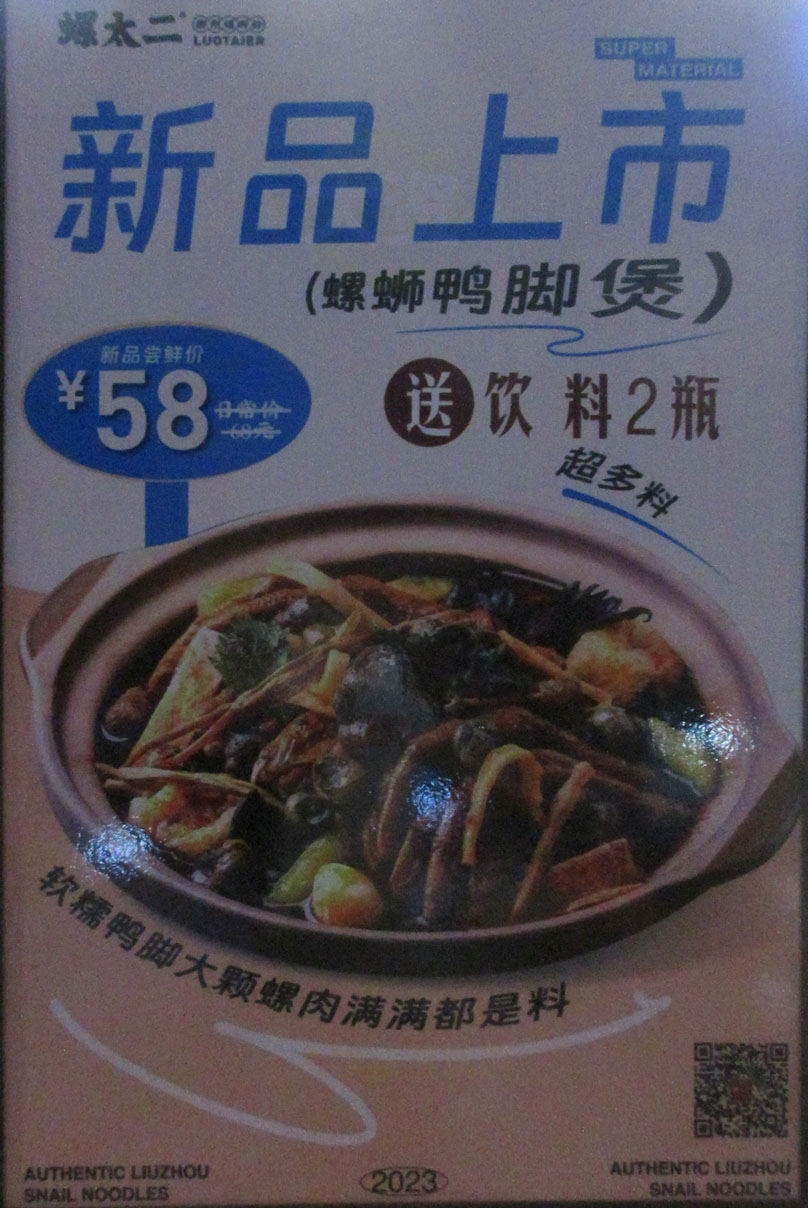 | 南亭商业街二号楼东北角临街 螺太二螺蛳粉 新品-螺蛳鸭脚煲 尝鲜价58元 送两瓶饮料 | ||||||
