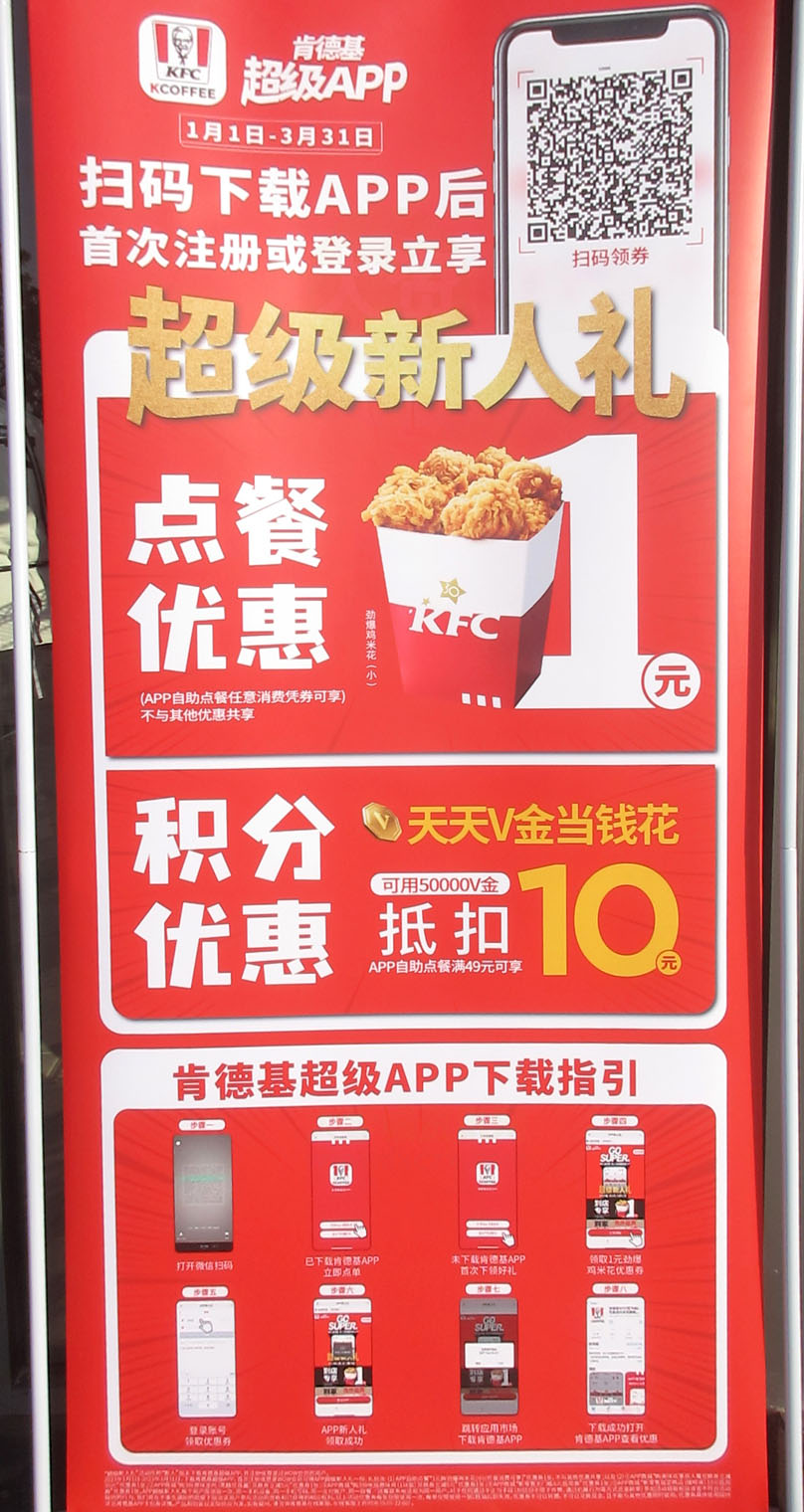 扫码下载肯德基超级APP后,首次注册或登录立享超级新人礼:1,点餐优惠-劲爆鸡米花小份只需1元,2,积分优惠-购满49元可用50000V金抵10元