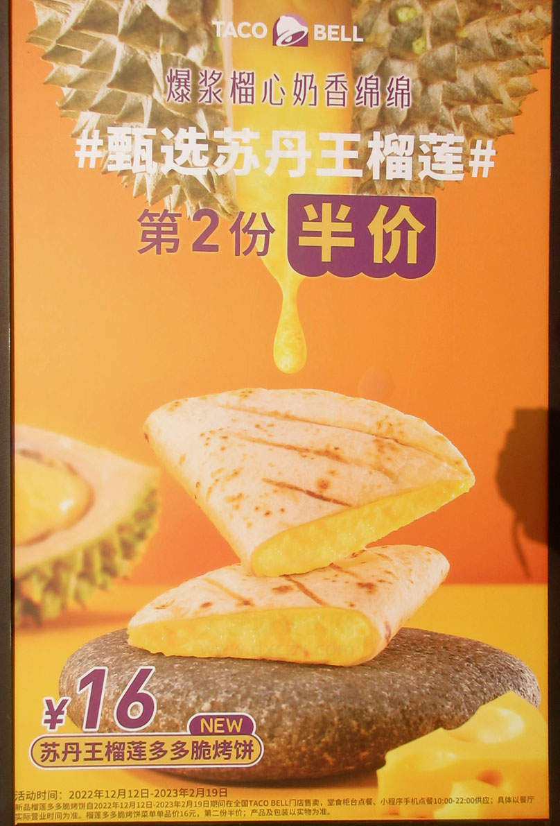| 墨西哥塔可饼餐厅 新品-苏丹王榴莲多多脆烤饼16元 爆浆榴心奶香绵绵,甄选苏丹王榴莲 第2份半价 活动时间2022.12.12-2023.02.19 | ||||||