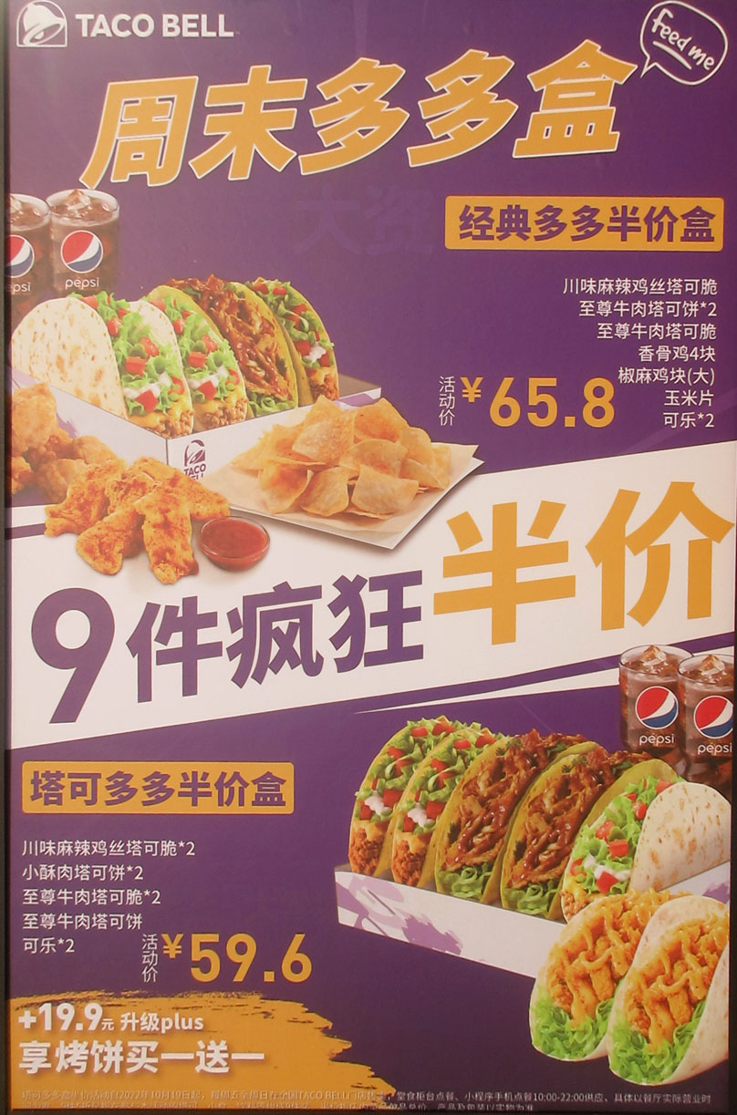 墨西哥塔可饼餐厅 周末多多盒9件疯狂半价 经典多多半价盒65.8元,塔可多多半价盒59.6元,+19.9元升级plus享烤饼买一送一