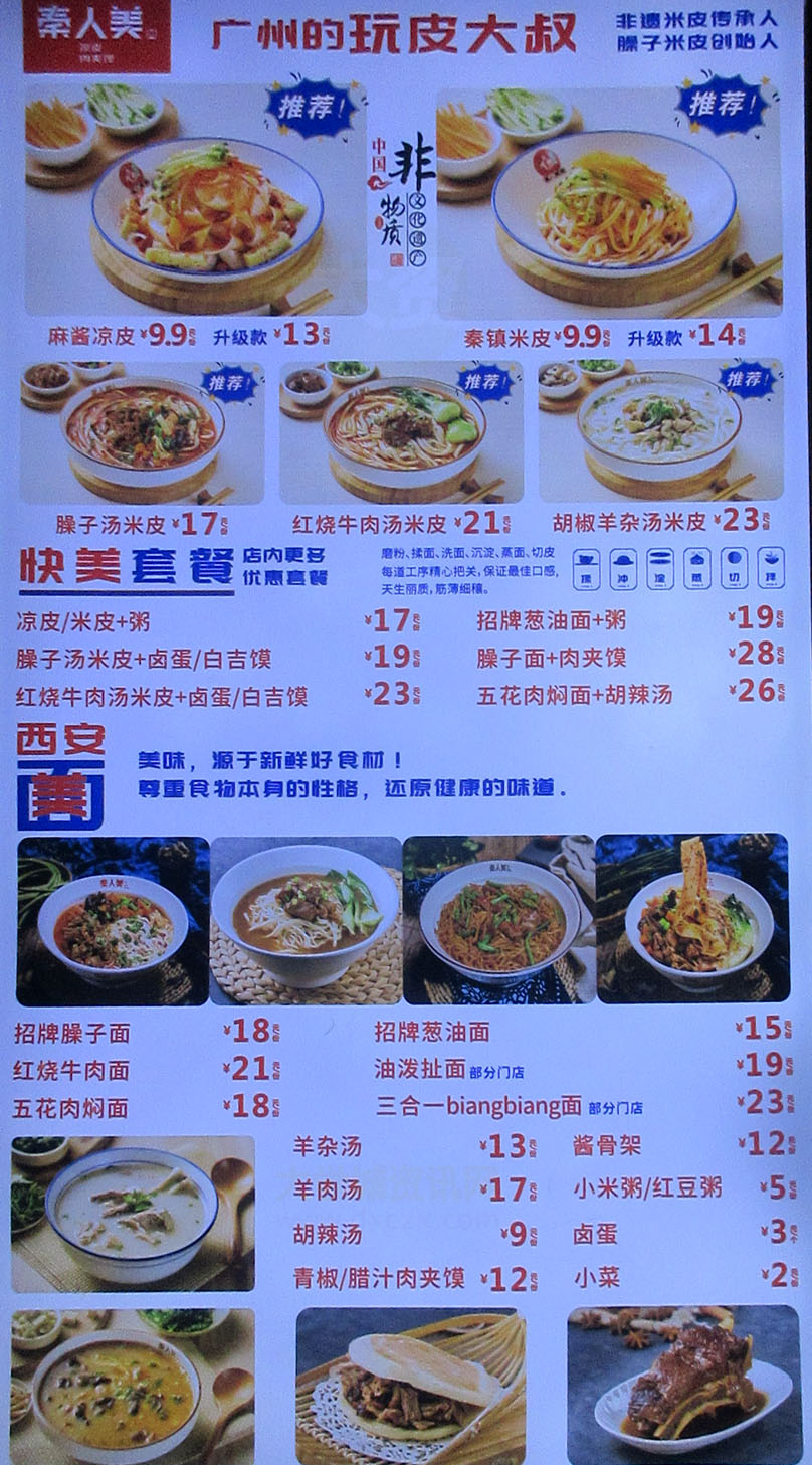 新天地东街南端首店 秦人美食 非遗米皮传承,臊子米皮创始人 臊子汤米皮17元1份、红烧牛肉汤米皮21元1份、胡椒羊杂汤米皮23元1份