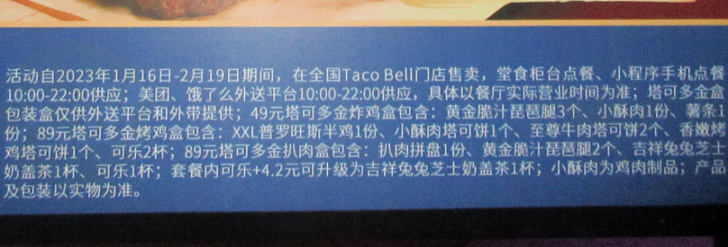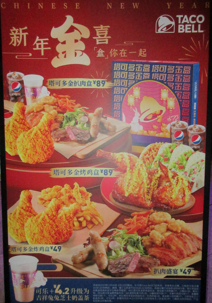 | 北亭青创汇 塔可饼店 新年金喜,盒你在一起 塔可多金扒肉盒89元,塔可多金烤鸡盒89元,塔可多金炸鸡盒49元,扒肉盛宴49元;可乐+4.2元升级为吉祥兔兔芝士奶盖茶 活动期1月16日-2月19日 | ||||||