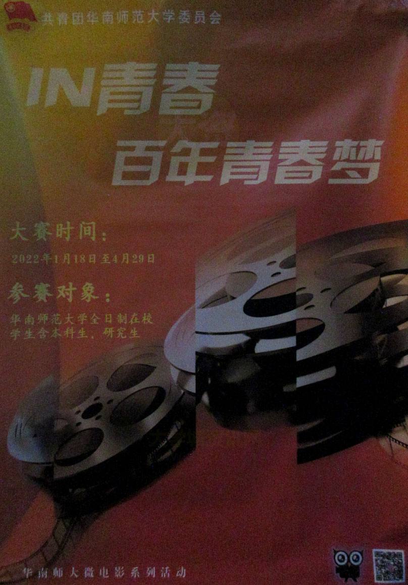 华南师大微电影系列活动·IN青春 百年青春梦 大赛时间2022.01.18-04.29 参赛对象:华师全体本科生研究生
