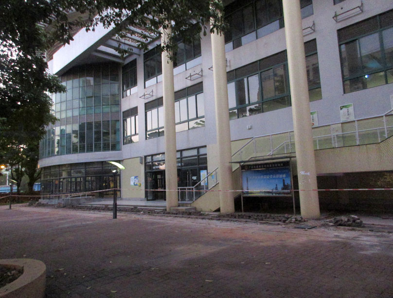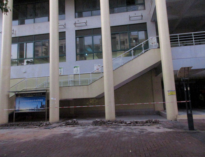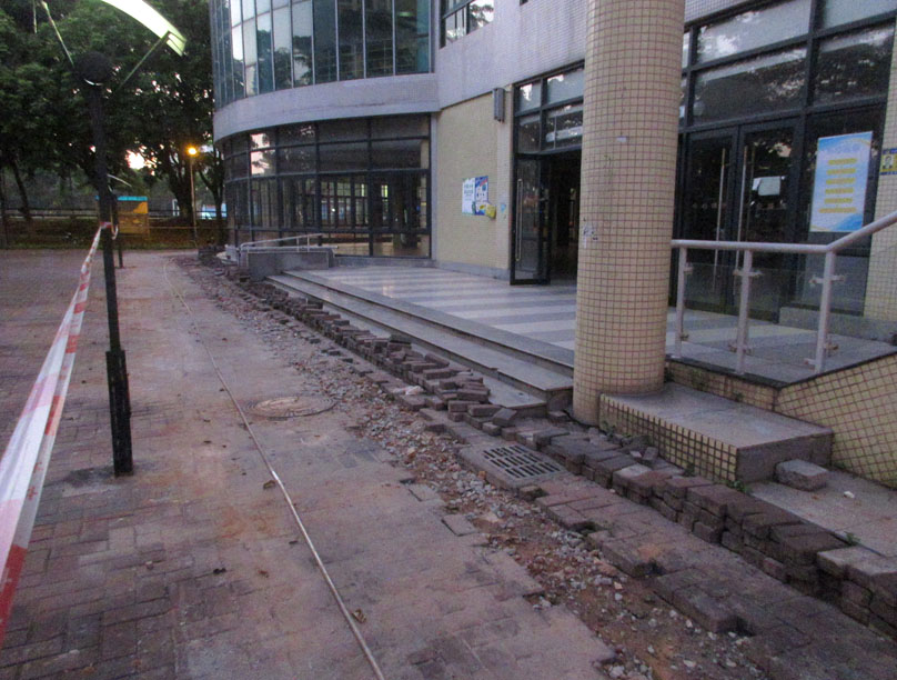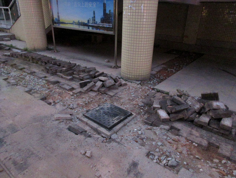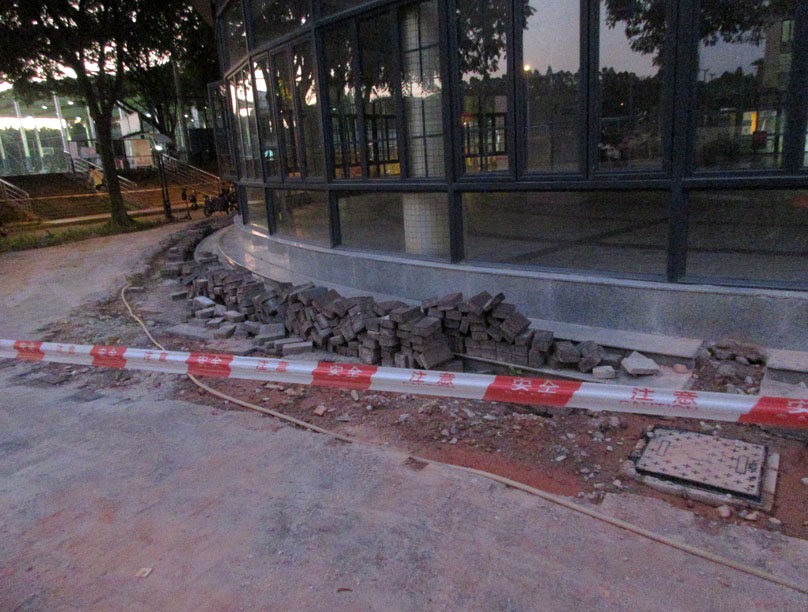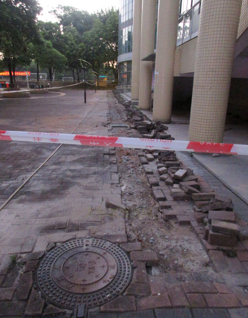 | 华师南区楠园饭堂一楼西南外侧这个地下管道挖掘施工看着应该是对应一楼内架空层使易于排水流出 | ||||||