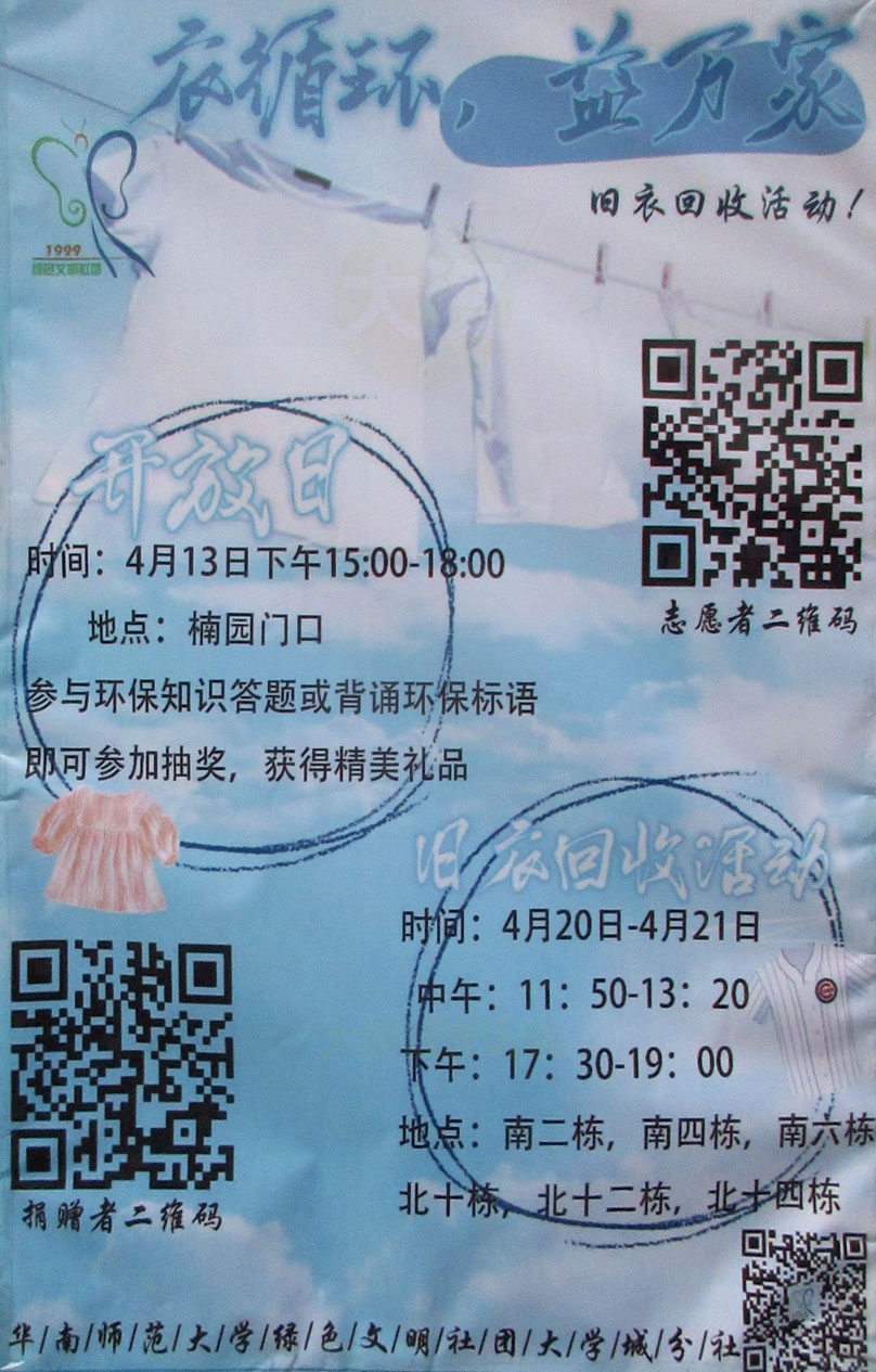 华师·绿色文明社团-旧衣物回收活动 4月20-21日中午11点50-13点20 下午17点30-19点 生活区南北区 4月13日下午楠园有开放日活动,可提前了解