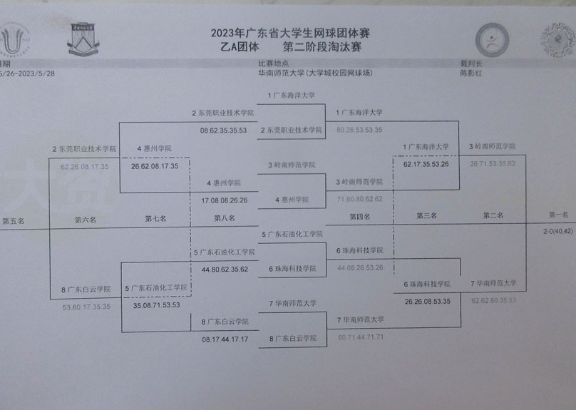 第二届广东省大学生网球高校团体赛今天上午结束所有赛事争夺 甲组-普通本科直招组,总共有16所高校代表队参赛,最终暨大和中大晋级到最后决赛,分享冠亚军 乙A乙B和丙组都参赛队伍数量偏少 就是甲组方面,也有诸如南医大、华农、广中医、广大、广州医科、广师大等省内名校没有参赛
