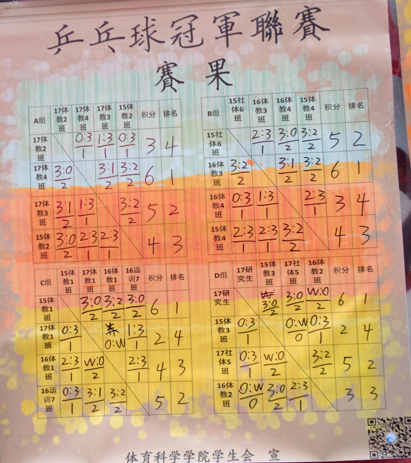 2017体育科学学院乒乓球冠军联赛赛果公布