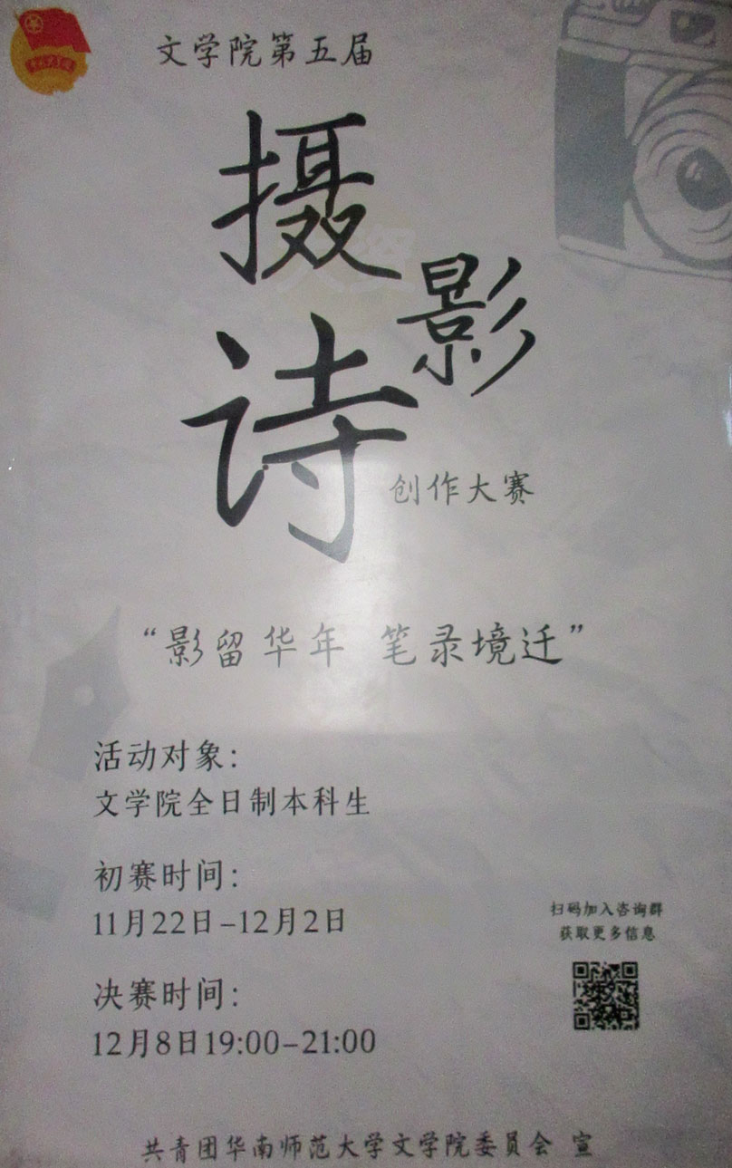 华师-文学院第五届摄影诗创作大赛 初赛11.22-12.02 决赛12.08晚19点-21点 扫码加入咨询群了解更多