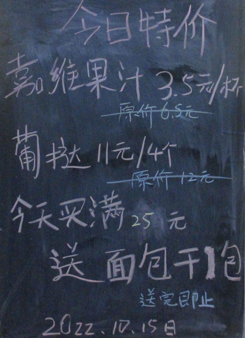 华工生活区C10栋北列 细工坊面包店 今日特价 嘉维果汁3.5元1杯,原价6.5元 葡挞11元4个,原价12元 今天买满25元送面包干1包 2022.10.15