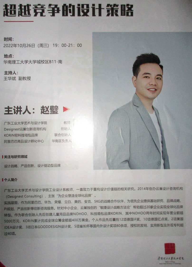 超越竞争的设计策略 2022.10.26周三晚19点-21点 教学区B11栋南座 主讲人-赵璧 主持-王华斌 |