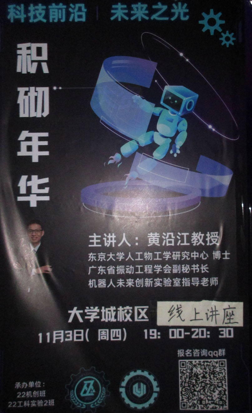 | 科技前沿,未来之光 主题讲座-积砌年华 11月3日周四晚19点-20点30 线上视听 主讲人:黄沿江教授 报名扫码进咨询群 | ||||||