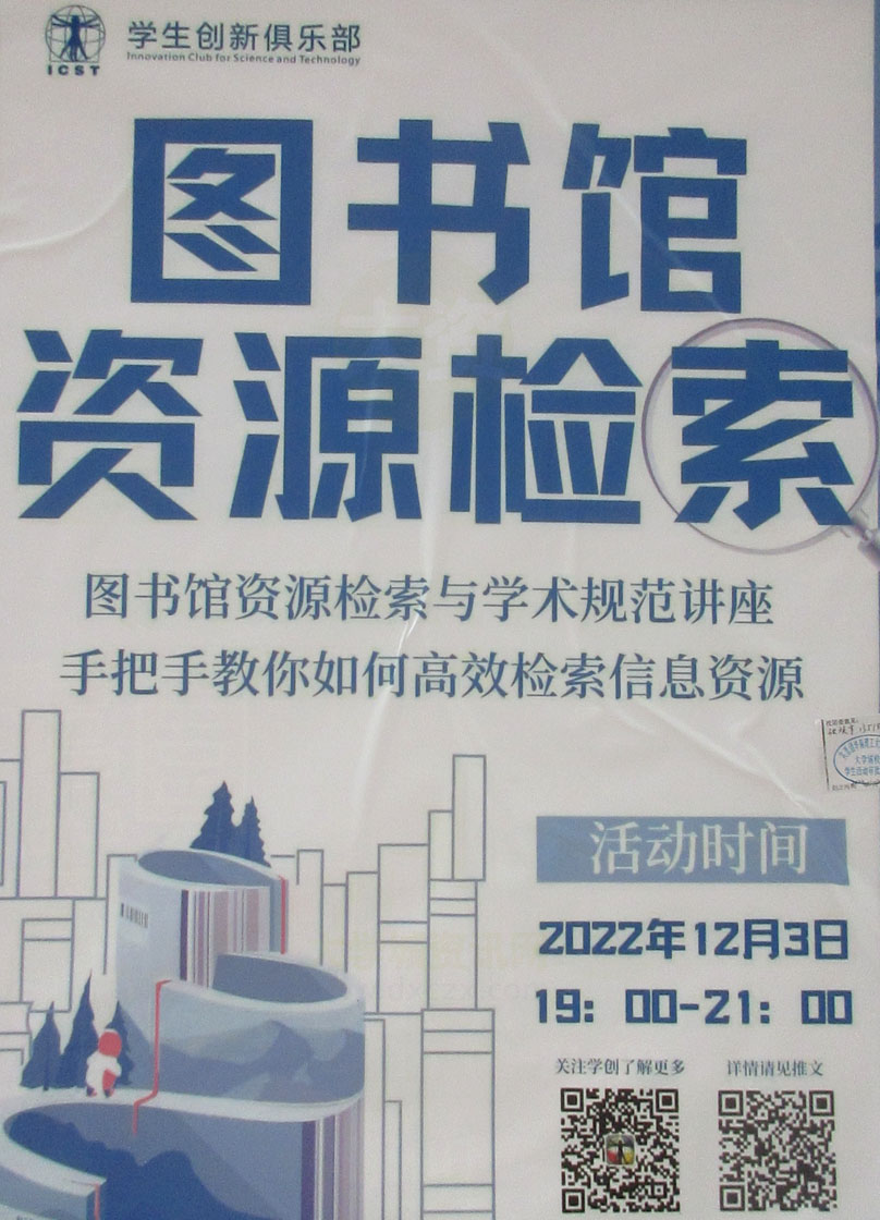 学创俱乐部-图书馆资源检索 图书馆资源检索与学术规范讲座 手把手教你如何高效检索信息资源 2022.12.03周六晚19点-21点 详情扫码查看推文 |