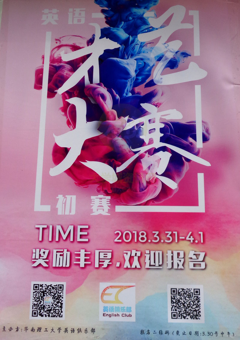 | 英语才艺大赛初赛 2018.3.31-4.1 奖励丰厚,欢迎报名 | ||||||