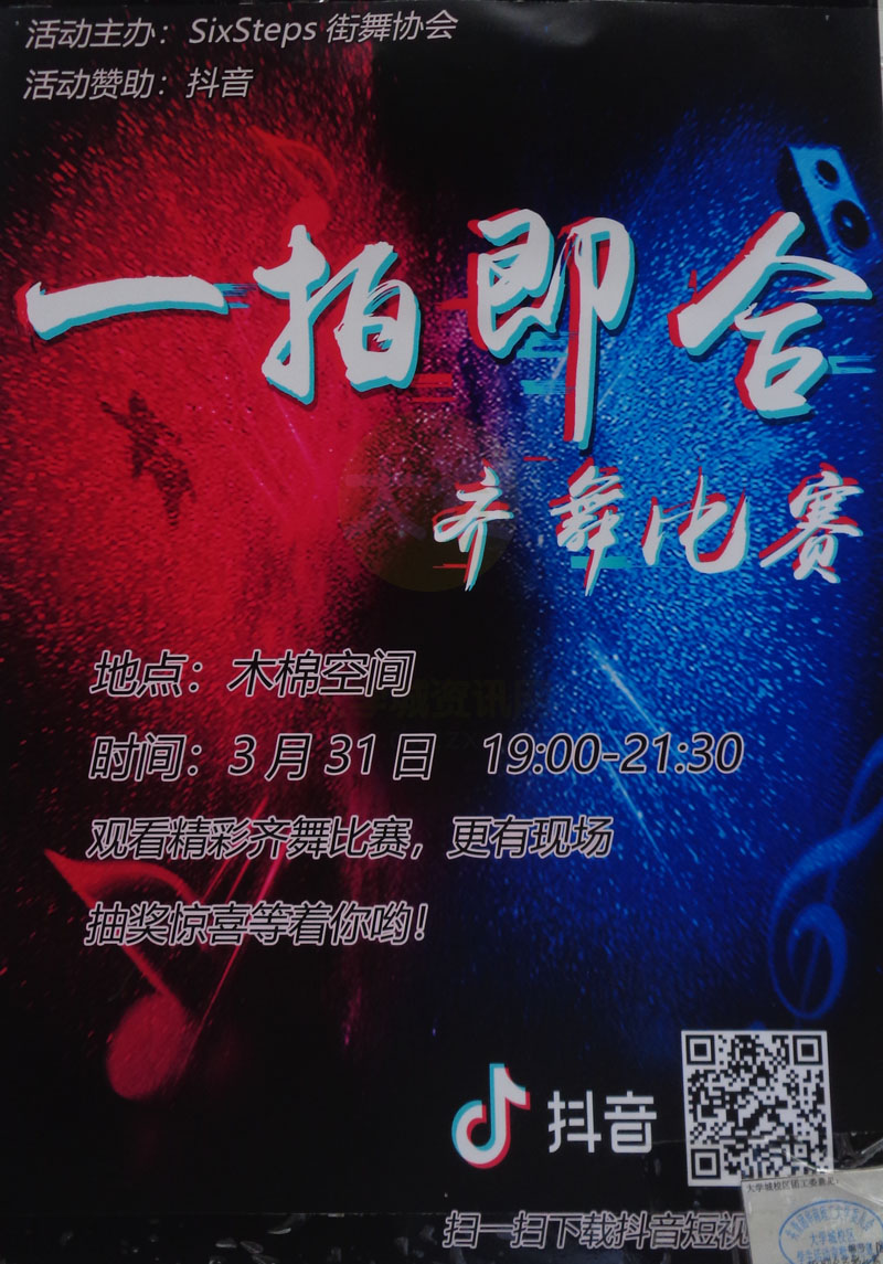 | SixSteps街舞协会|一拍即合齐舞比赛 地点:木棉空间 时间:3月31日 19:00-21:30 | ||||||