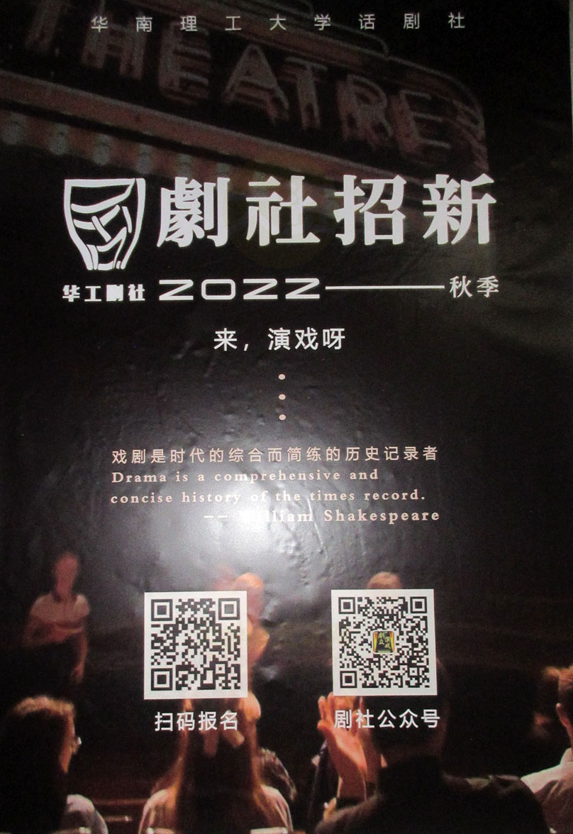 华南理工大学话剧社 2022秋季招新 扫码报名&关注剧社公号 |