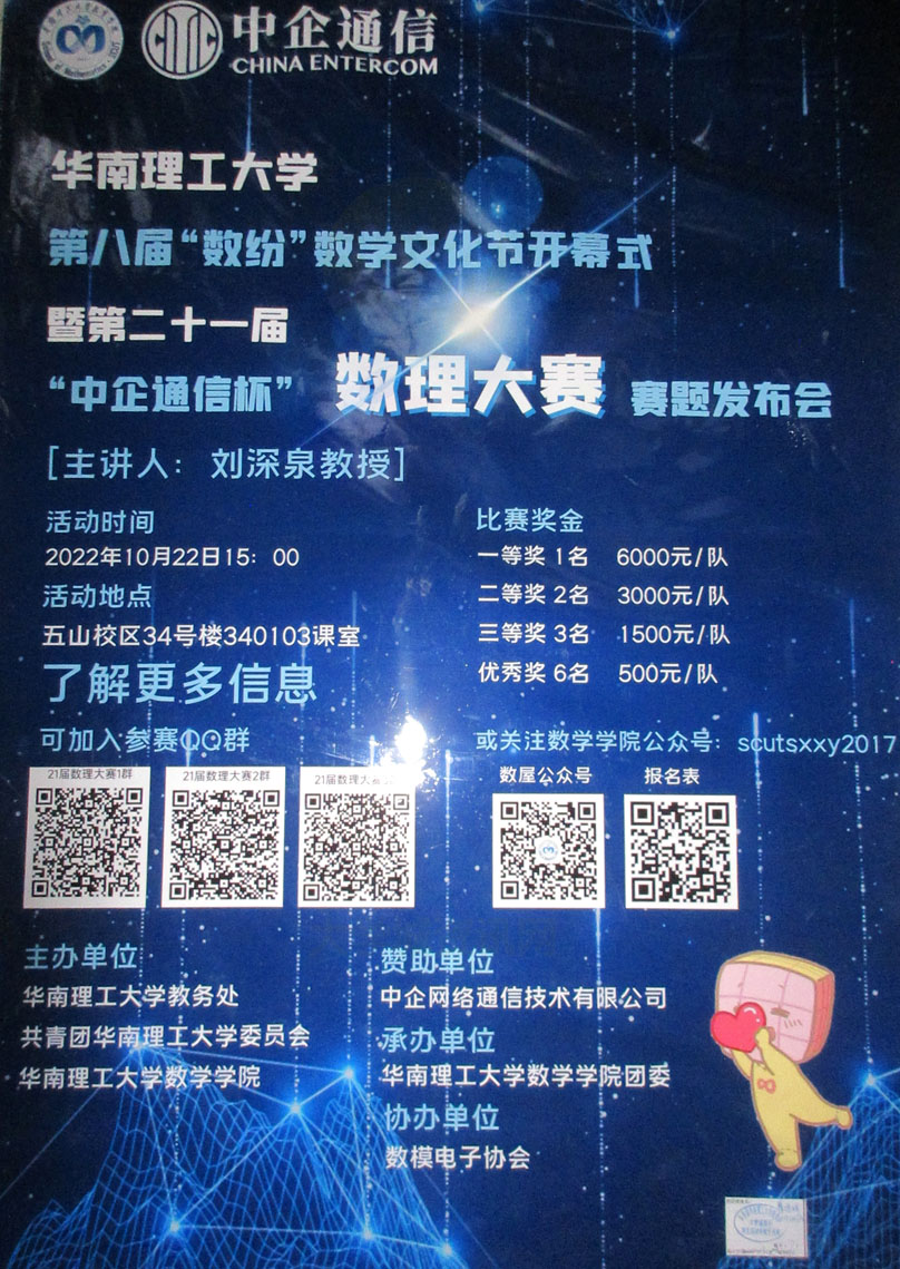 华工-第八届数纷数学文化节开幕式暨第二十一届中企通信杯数理大赛赛题发布会 2022.10.22周六下午15点 五山校区