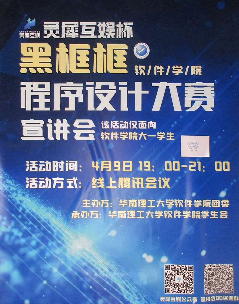 | 华工软件学院 灵犀互娱杯·黑框框程序设计大赛宣讲会 4月9日19点-21点 | ||||||