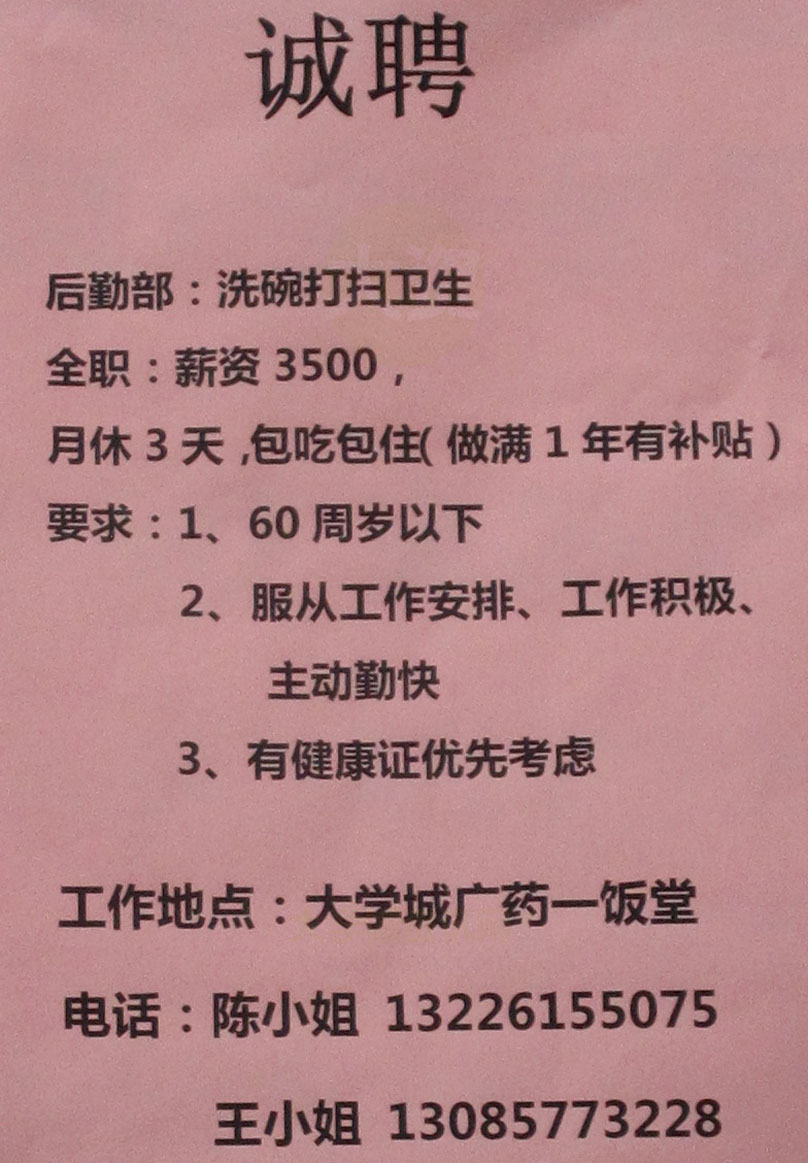 | 大学城广药一饭堂 诚聘洗碗打扫卫生 薪资3500 月休3天,包吃住 联系13226155075陈小姐 | ||||||