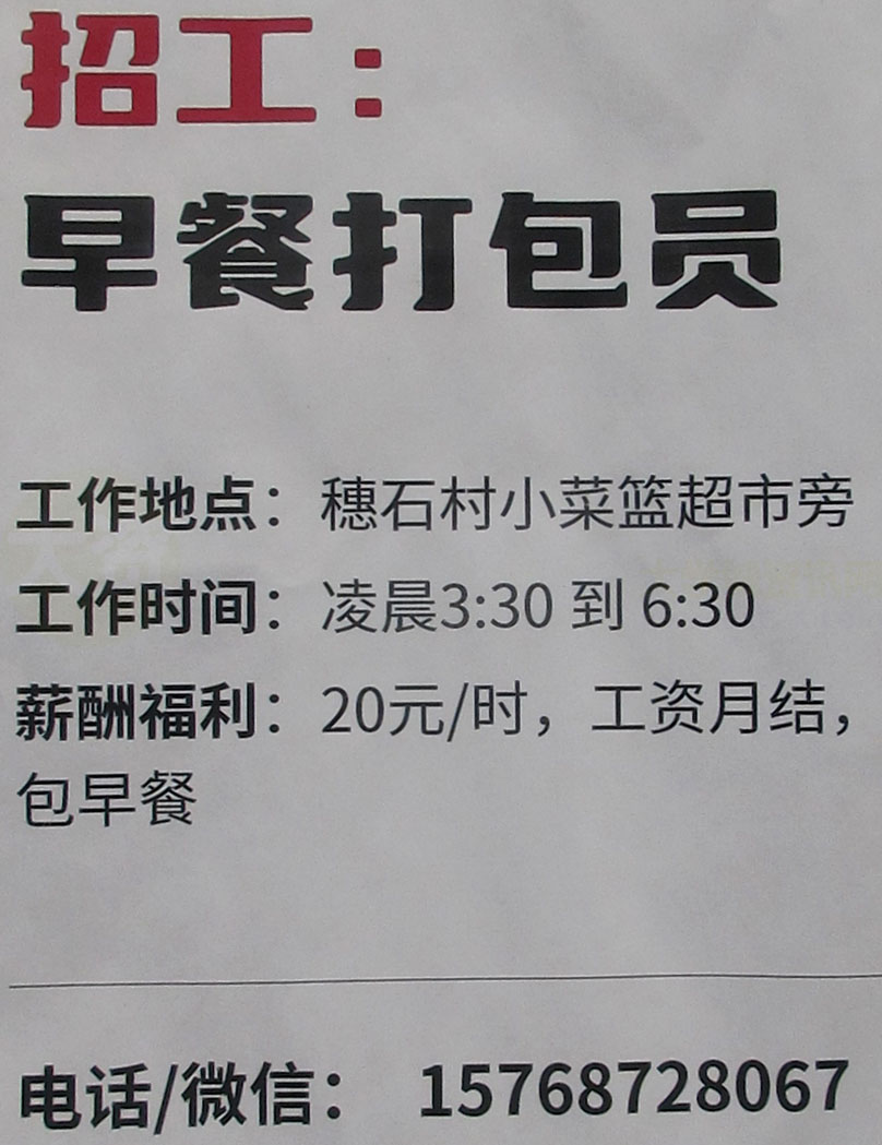 | 穗石村小菜篮超市旁 招早餐打包员 20元1小时,月结,包早餐 工作时间凌晨3点半到6点半 微电15768728067 | ||||||