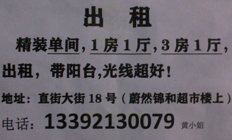 穗石 出租 精装单间,1房1厅,3房1厅出租,带阳台,光线超好 地址:直街大街18号(蔚然锦和超市楼上) 电话13392130079黄小姐 |