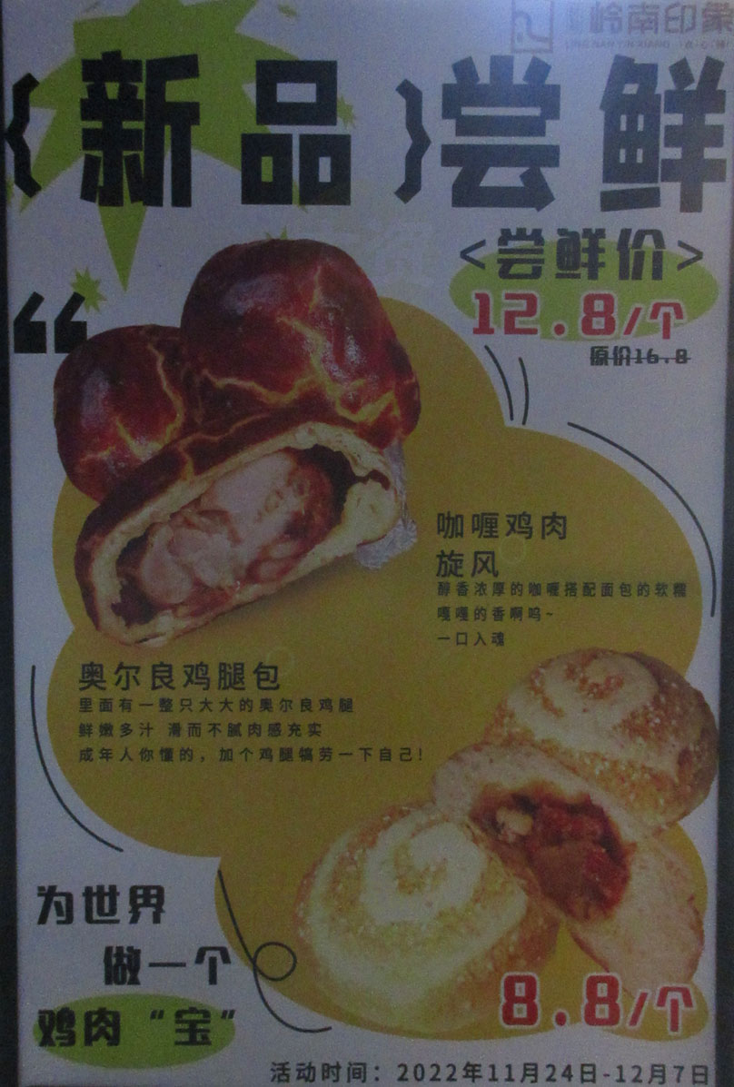 穗石大道南端 大利家超市正门旁 岭南印象蛋糕店 新品尝鲜 奥尔良鸡腿包12.8元1个 咖喱鸡肉旋风8.8元1个 活动期2022.11.24-12.07