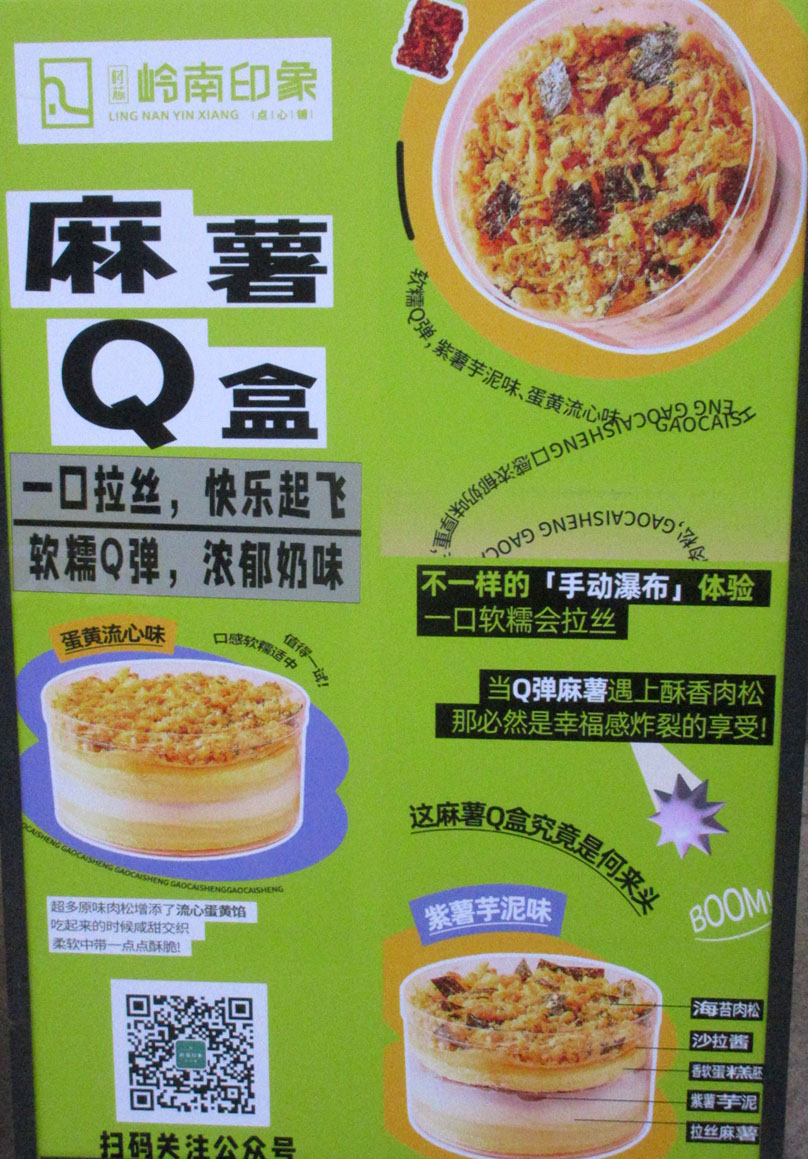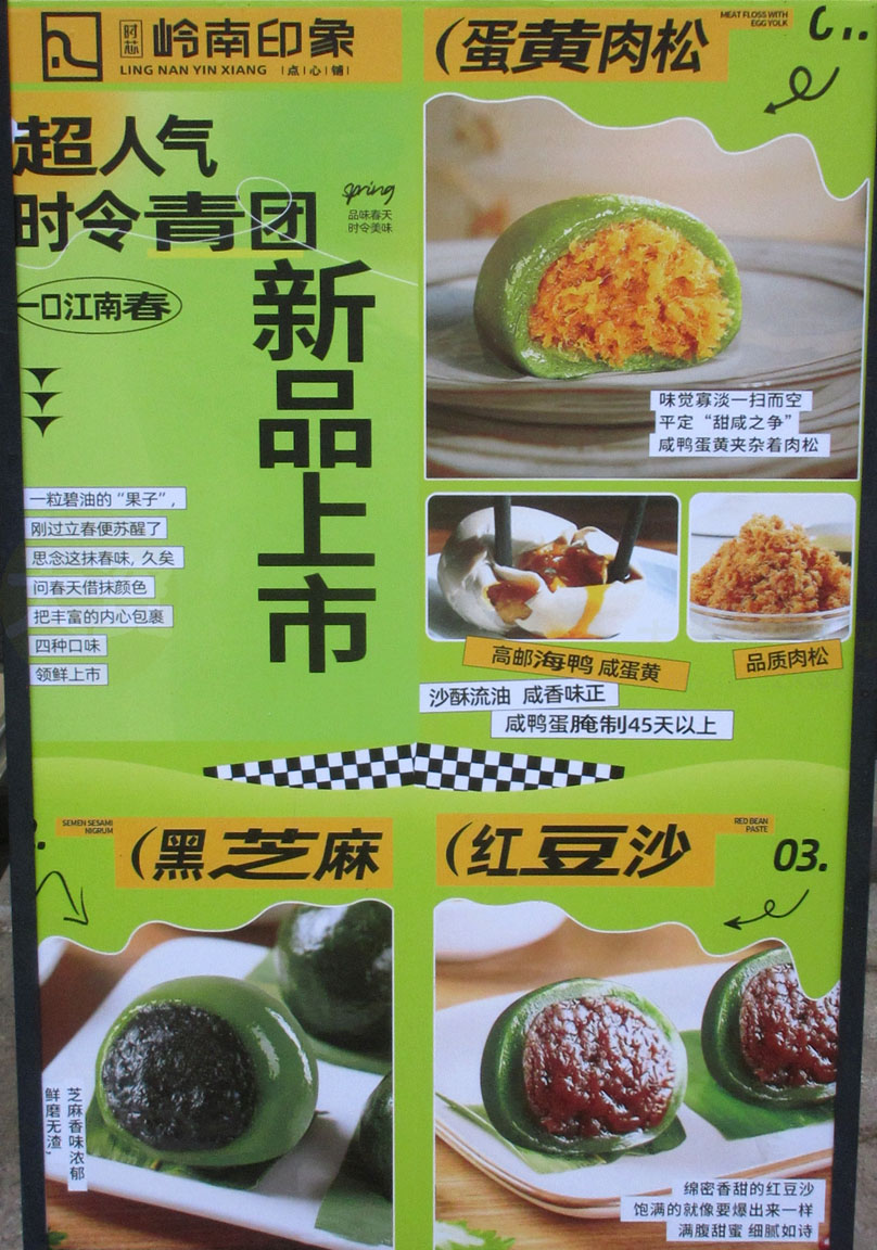 | 穗石村穗石大道西南端 岭南印象 青团系列新品上市 蛋黄肉松&黑芝麻&红豆沙 多种馅料口味;麻薯Q盒推荐 蛋黄流心味&紫薯芋泥味 | ||||||
