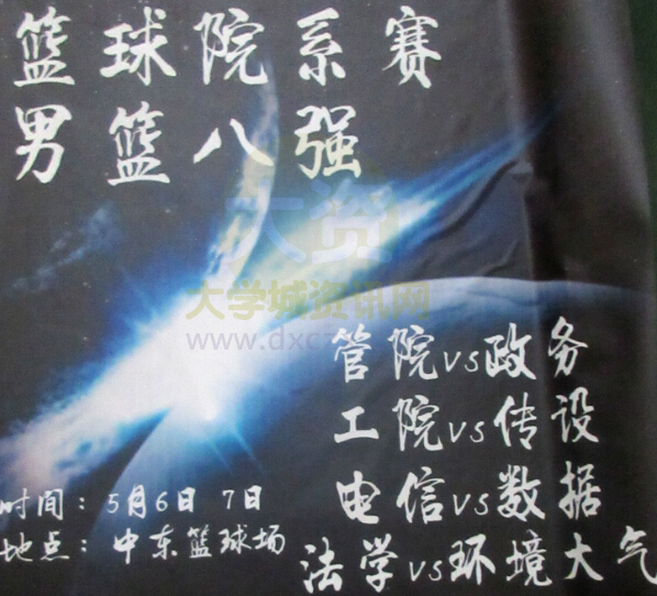 | 篮球院系赛男篮八强5月6日、7日 管院VS政务 工院VS传设 电信VS数据 法学VS环大 | ||||||