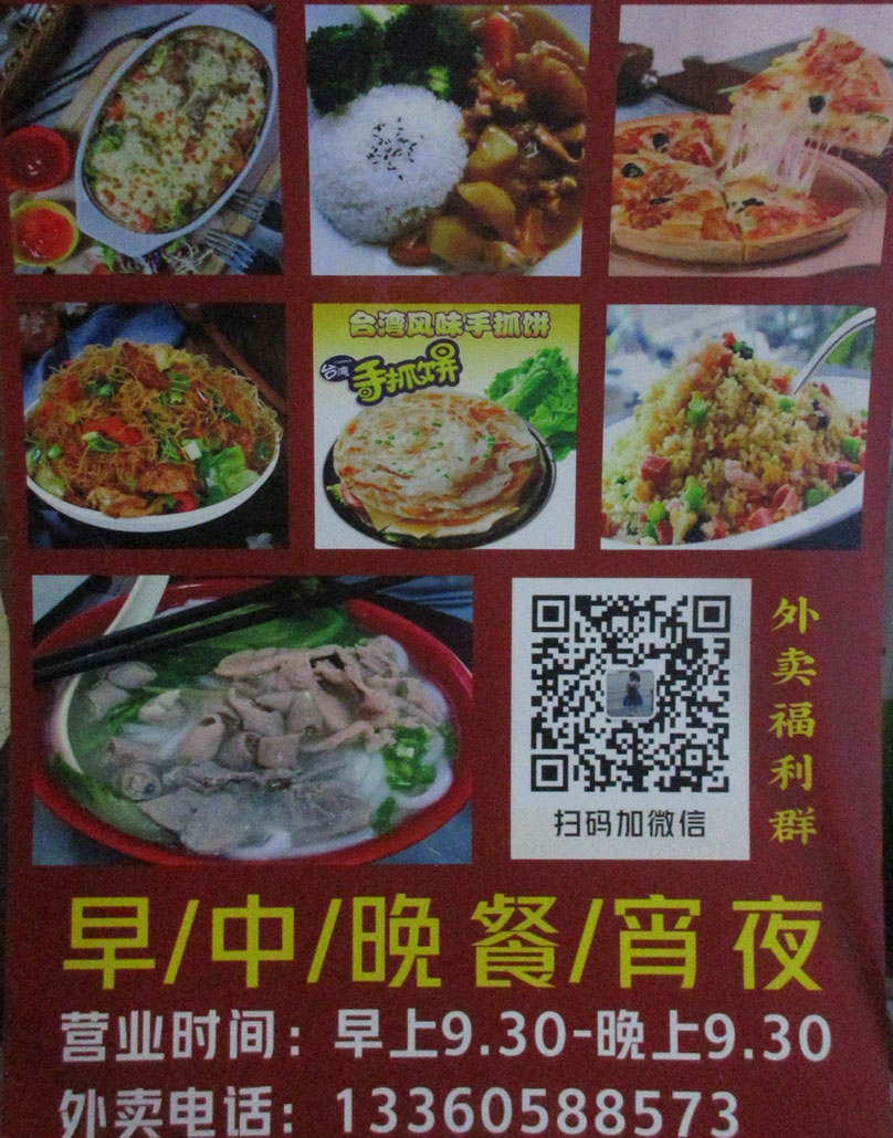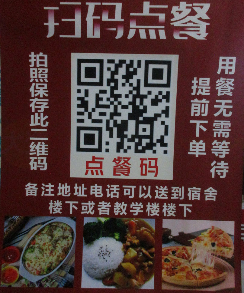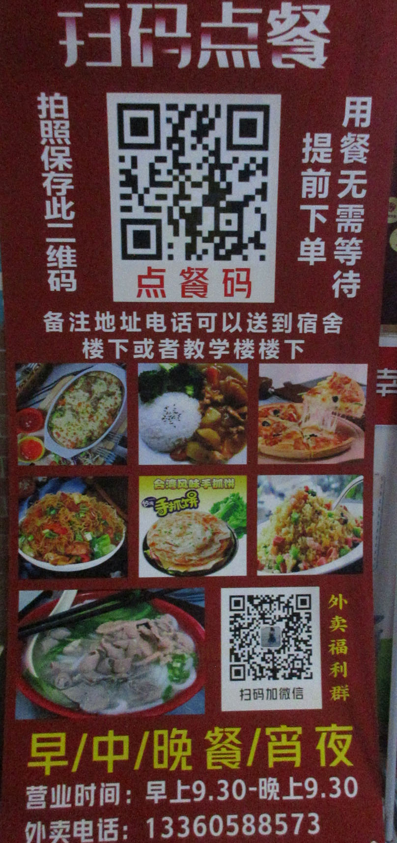 中大三饭北门外 好像放了个扫码点餐外送到宿舍楼下的提示 而且是早中晚餐及宵夜都送