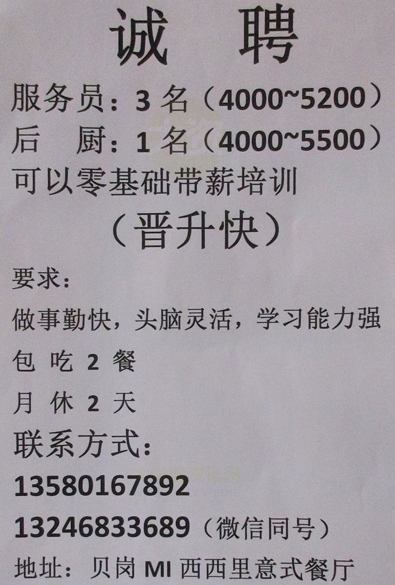 贝岗-MI西西里意式餐厅 诚聘 服务员3名&后厨1名 包吃两餐月休两天 13580167892