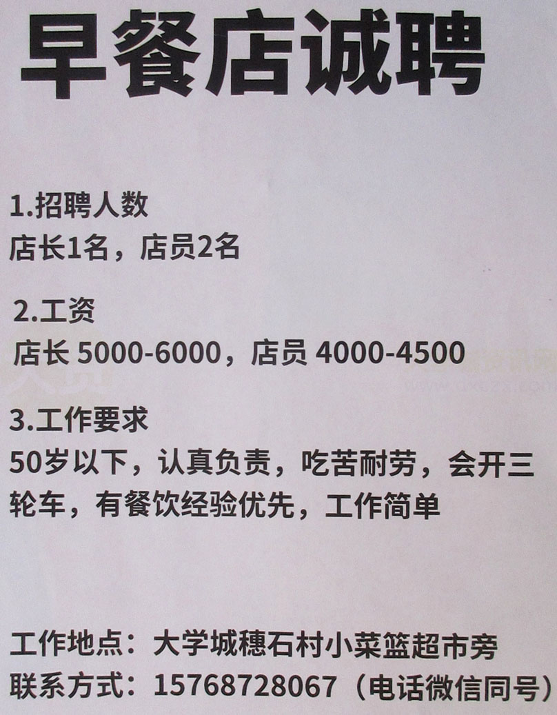 穗石村某早餐店诚聘店长1名,店员2名