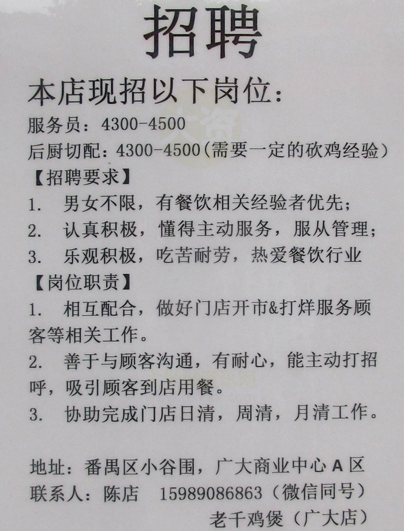 大学城 广大商业中心A区酒店大堂 老千鸡煲店招聘服务员与后厨切配 联系15989086863陈店