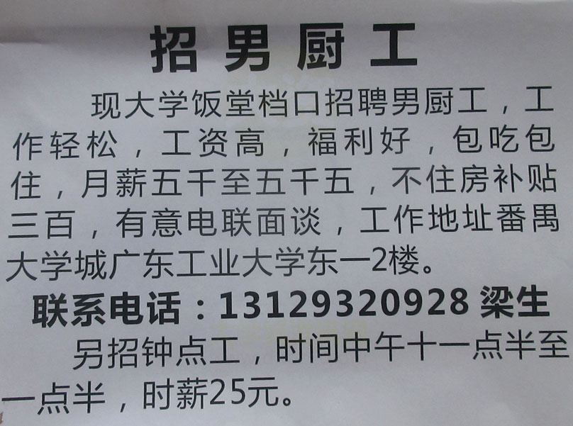 广州大学城广东工业大学生活东区一饭2楼招聘男厨工及钟点工 联系13129320928梁生