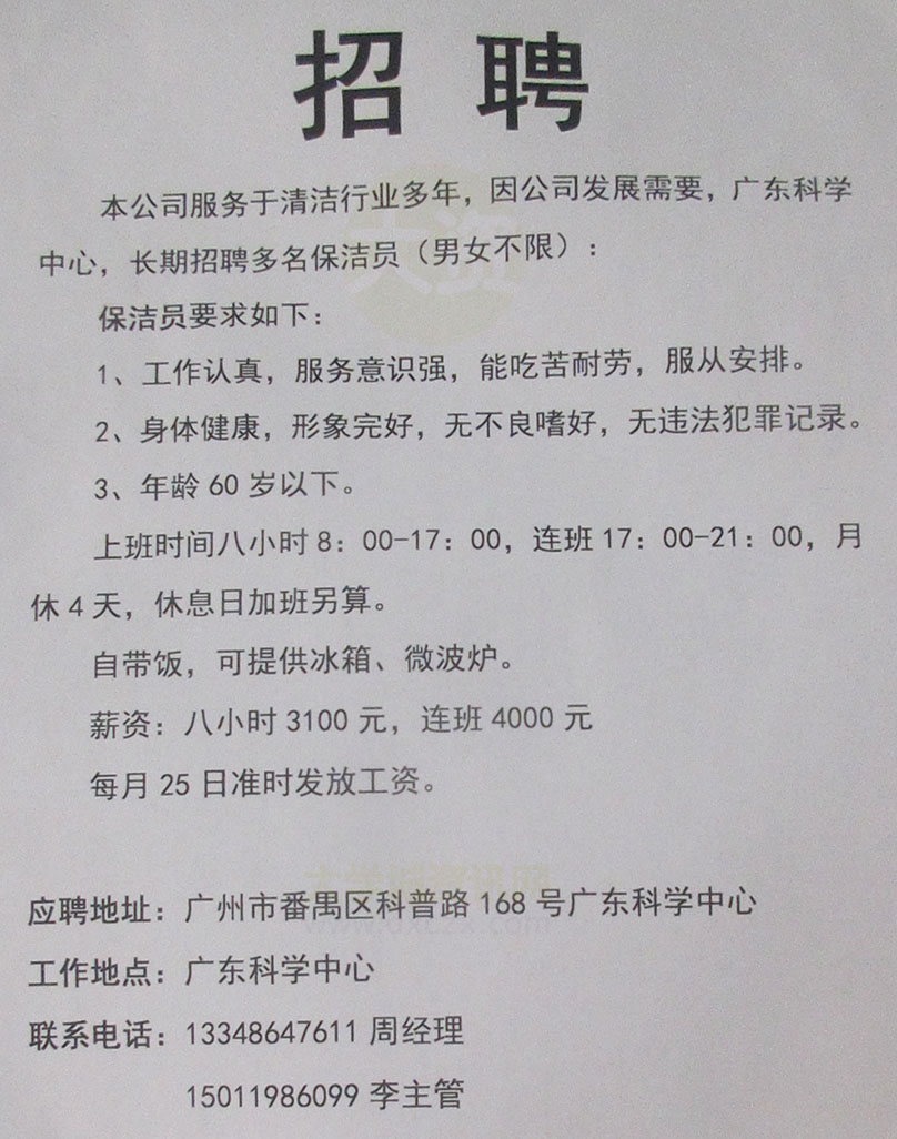 广东科学中心长期招聘多名保洁员 月薪八小时3100元 连班4000元