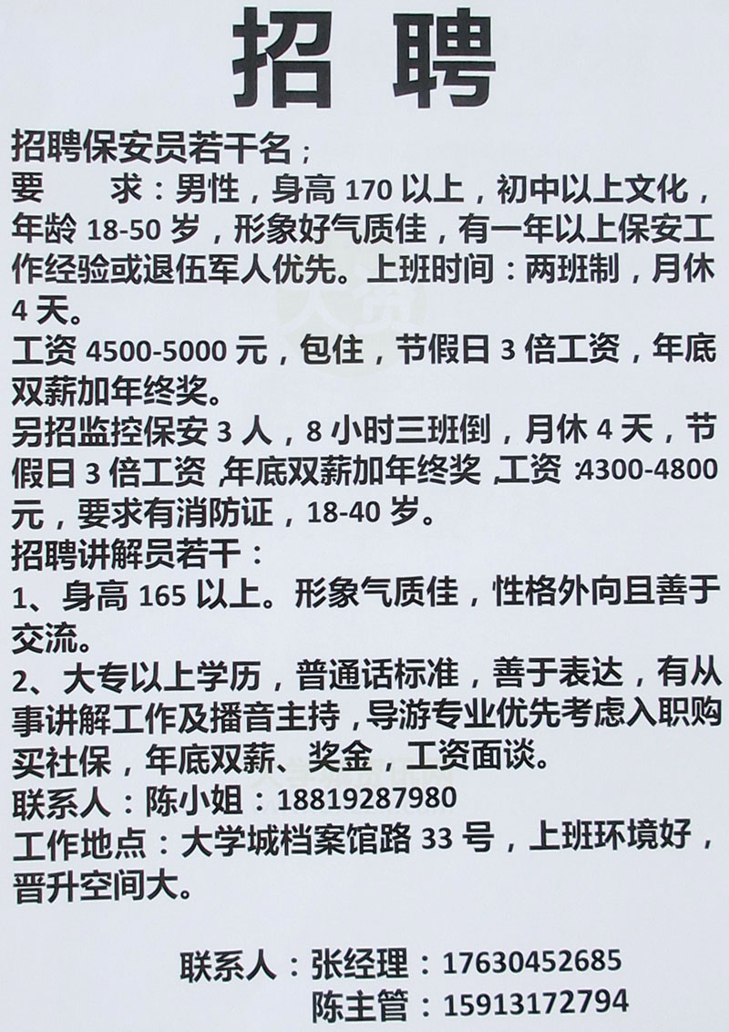 国家档案馆招聘保安员若干名,监控保安3名,讲解员若干