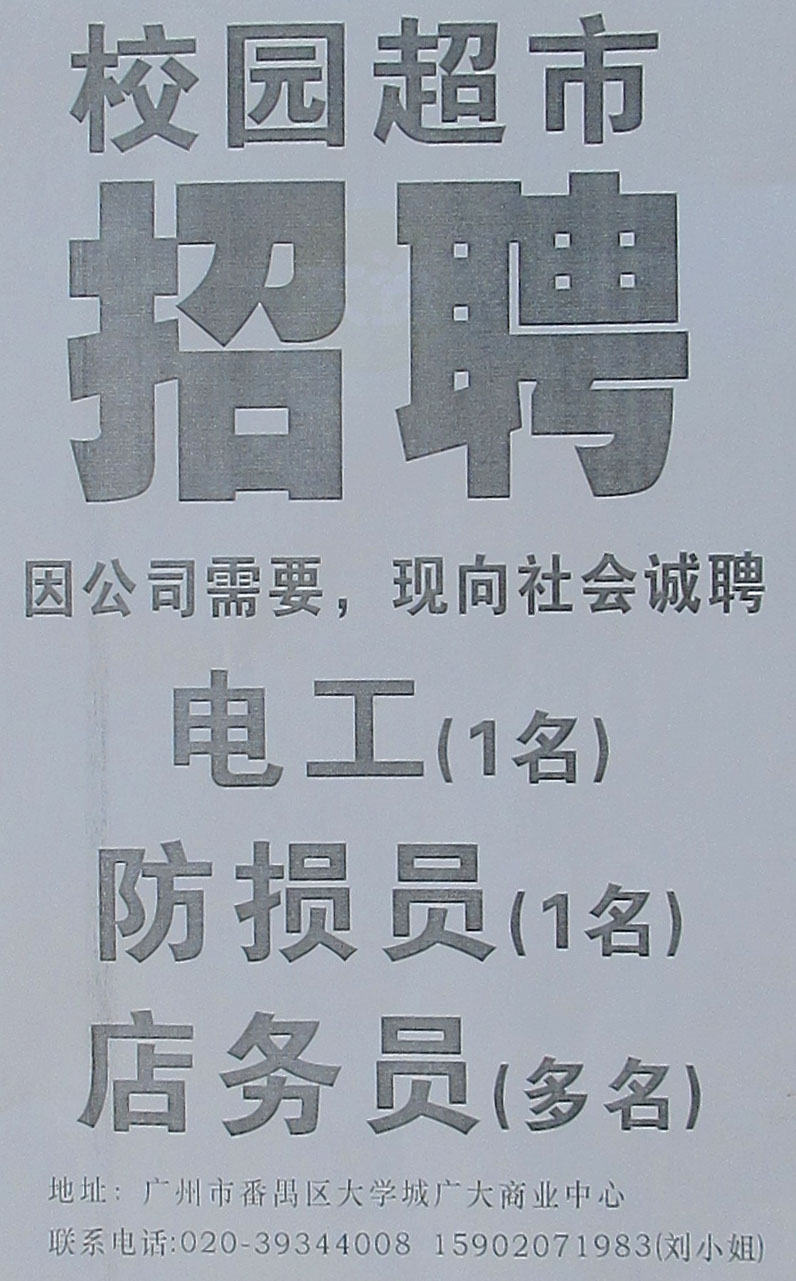 广大商中校园超市招聘电工、防损员各1名,店务员多名