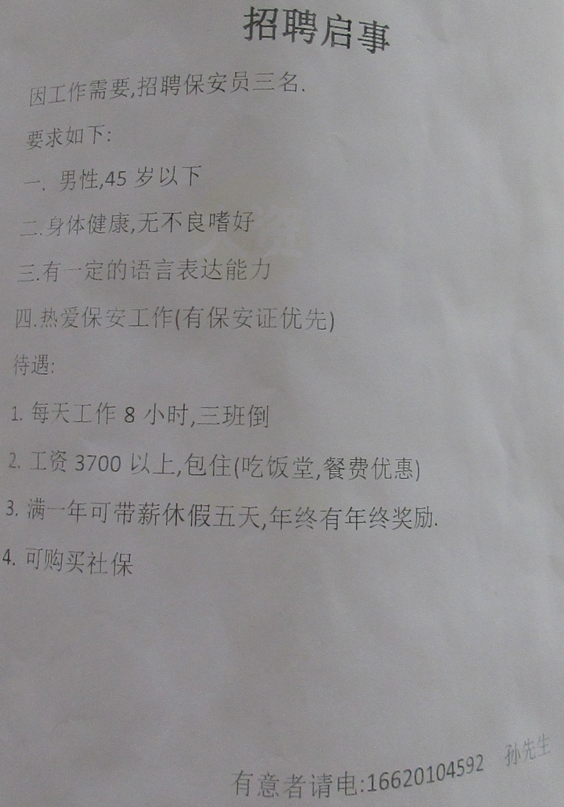 招聘启事 因工作需要,招聘保安员三名 工资3700以上、包住 有意请电16620104592