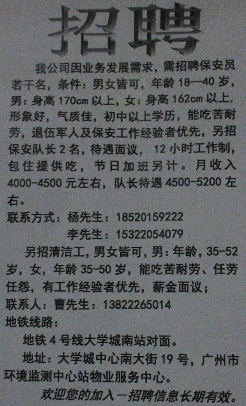 南区-广州市环境监测中心站物业服务中心招聘保安员若干名、保安队长2名