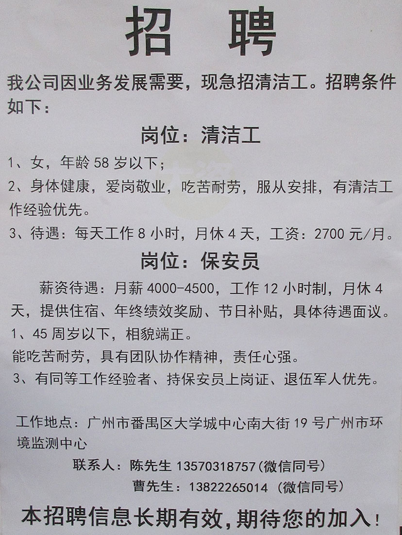 大学城南区中心南大街-广州市环境监测中心招聘清洁工和保安员